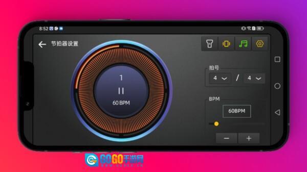 进入【节拍器设置】页面后,能看到当前节拍是【1】、速度为【60-BPM】,可以调整这些参数来辅助进行节奏练习。