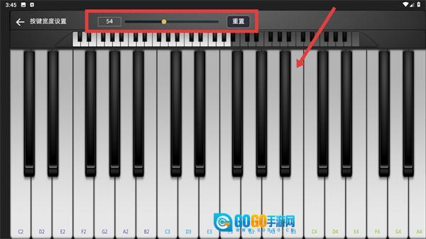 4、进入【按键宽度设置】页面后,可通过拖动滑块来调整按键宽度的具体数值(例如当前显示为【54】),也能点击【重置】按钮恢复到默认设置,以此优化弹奏时的操作体验。