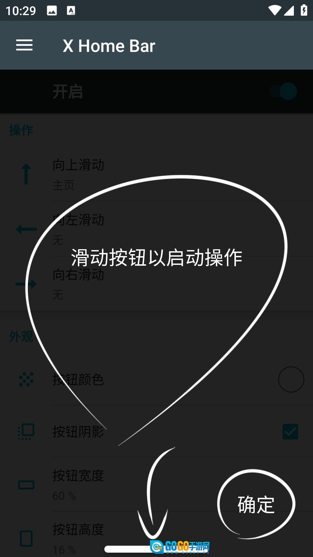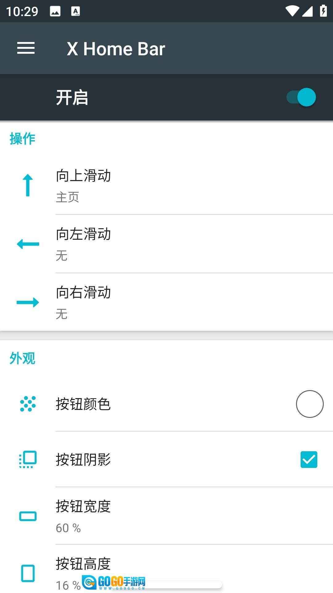 1、支持向上、向左、向右滑动的自定义操作,还可设置全屏显示、按钮颜色及高度等选项。
