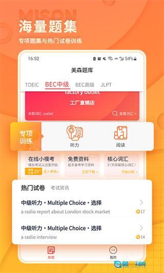 美森题库作为美森教育自主研发的刷题助学平台,收录了BEC考试、托业考试、日语能力考等多种商务及语言能力考试的题库资源。平台精选大量优质试卷与习题,依托美森教育自研的专业内容,深入解析考试重点、助力突破学习难点,并为学习者提供个性化的学习建议与规划方案。它聚焦于英语和日语考试的能力提升需求,致力于为用户构建全方位的快速提升通道,是助力语言能力进阶的专业学习辅助工具。