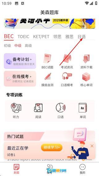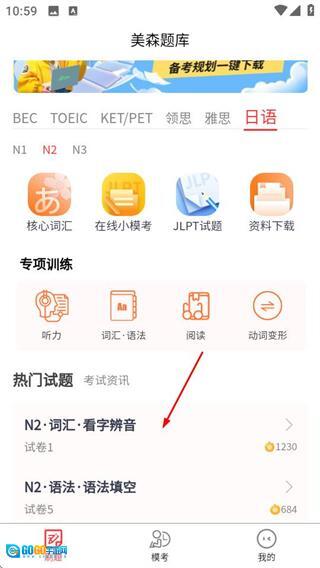1、打开美森题库首页后,点击页面顶部的日语选项,即可切换至日语题库页面。