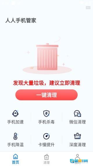 1、首页支持一键清理功能,手机杀毒与手机加速操作可通过一键方式完成。