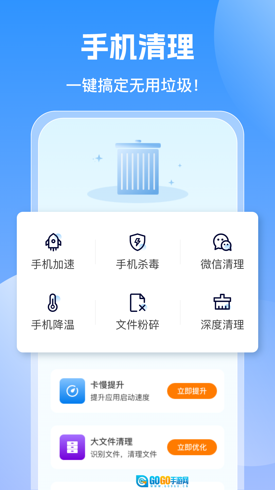 人人手机管家是一款功能完备的手机优化管理应用,为用户提供高效便捷的设备维护服务。它整合了深度清理、手机加速、杀毒防护、降温优化等关键功能,可精准识别并清理各类冗余垃圾、缓存文件及卸载残留。该软件操作简单,无需繁琐设置即可轻松使用,全方位保障手机性能与安全,助力用户的手机时刻保持流畅稳定的运行状态。