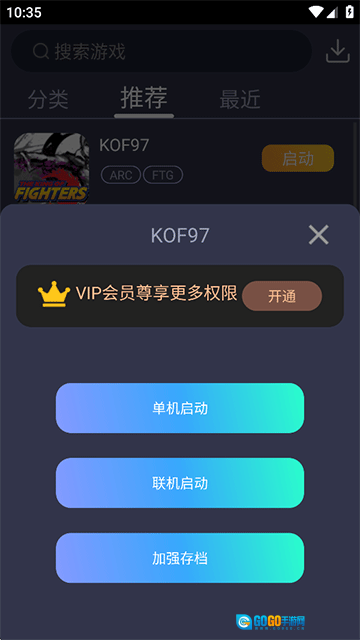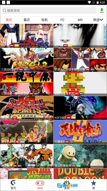 包含街机、FC、SFC、MD、GBA等多款经典游戏,具备游戏检索功能与一键启动游戏的便捷操作。