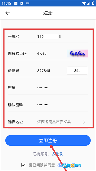 3、在注册页面依次填写手机号码、图形验证码、短信验证码和密码,选择所在地址后,勾选相关服务协议即可。