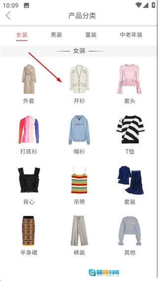 2、进入产品分类页面后,找到女装类目并选择其下的开衫分类,即可进入开衫商品列表页。