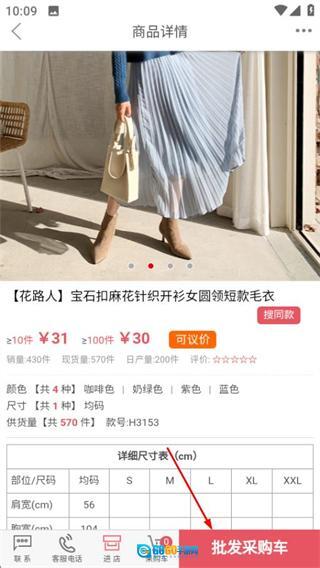 4、进入商品详情页面后,点击批发采购车按钮,即可进入商品规格选择界面。
