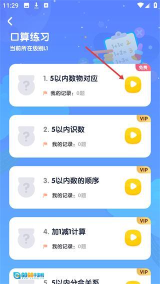3、进入【口算练习】页面后,找到标注为免费内容的【5以内数物对应】,点击它右侧的播放按钮,就能开始这项练习了。