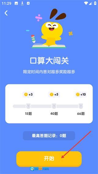 4、进入【口算大闯关】页面,此页面会展示不同答题数量对应的奖励,点击页面底部的【开始】按钮,就能参与本次闯关挑战。