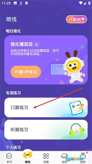 2、进入精练页面后,在【专项练习】板块里找到【口算练习】选项,点击此选项就能进入对应的练习页面。