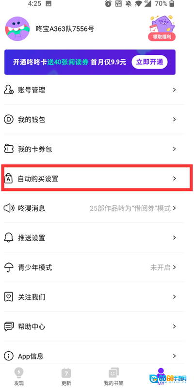 2、接着找到“自动购买设置”,找到对应的自动购买漫画,取消它就可以了。