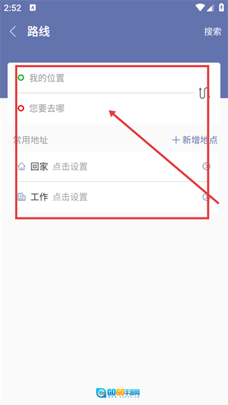 3、进入【路线】页面后,要先填写【我的位置】和【您要去哪】这两项信息,另外也可以设置【回家】-【工作】这类常用地址,这样能让后续的查询更快捷。