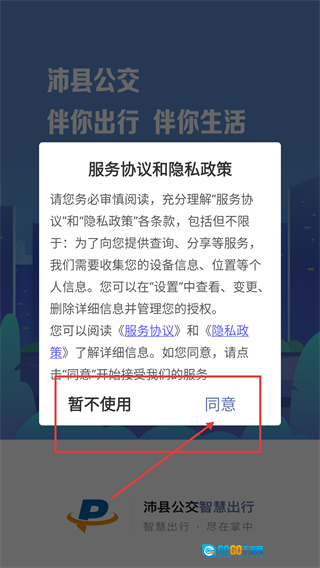 1、进入【沛县公交】后,需阅读【服务协议】与【隐私政策】,点击弹窗中的【同意】按钮,方可继续使用其出行服务。