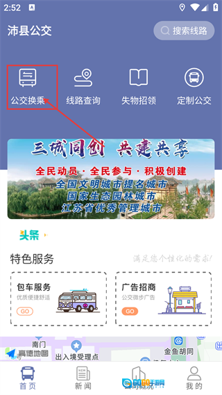 2、进入【沛县公交】首页后,能点击【公交换乘】功能,此外还有【线路查询】【失物招领】等服务入口,大家可根据自身需求选择相应功能使用。