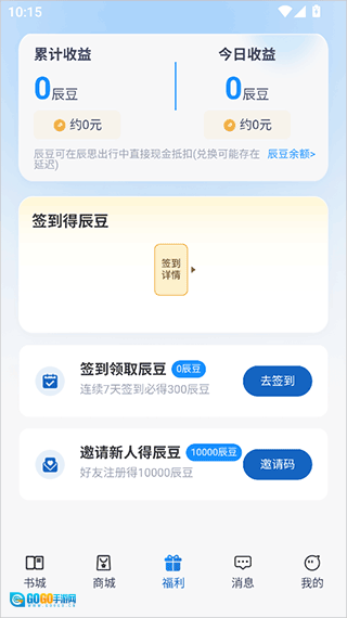 1、登录后进入福利页面,通过签到或邀请新用户获取平台的辰豆来赚取收益