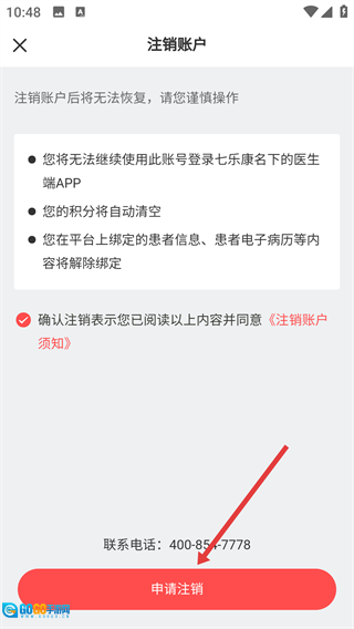 4、进入注销账户页面后,先勾选同意《注销账户须知》,再点击“申请注销”按钮来提交注销请求。