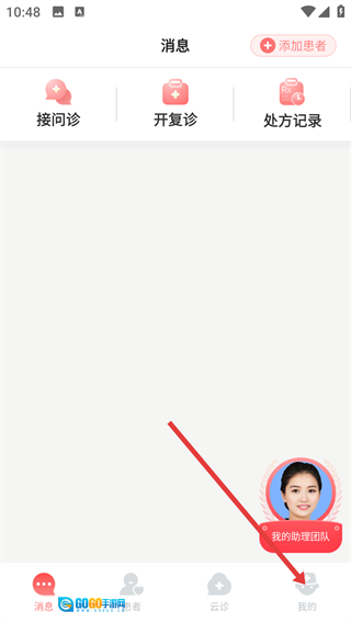 1、在消息页面,点击底部的“我的”选项进入相应页面后,就能看到接问诊、开复诊等功能的入口。