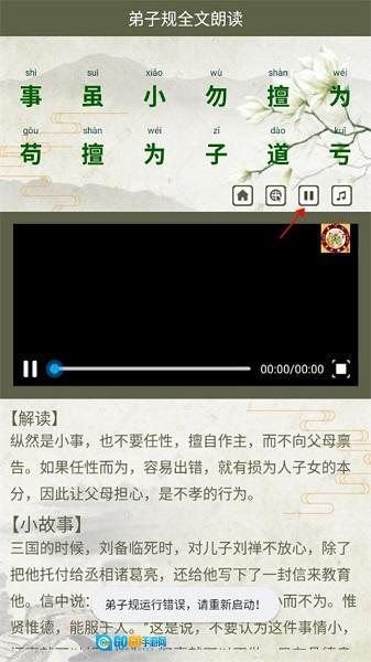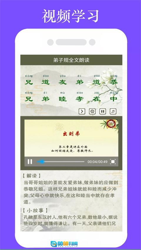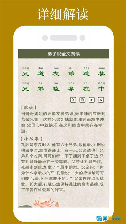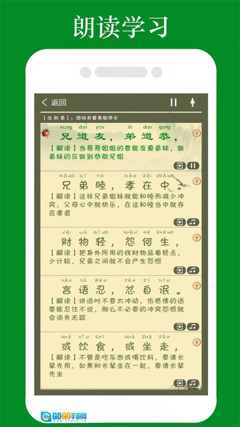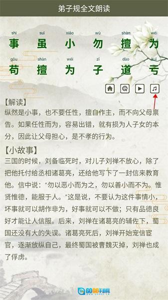 弟子规全文朗读是一款优质的早教软件,软件包含完整的《弟子规》文本内容,有真人朗读并附带拼音,能让儿童轻松跟着朗读。软件通过朗读、演示和动画等形式教学,让孩子们以视听结合的方式学习,增强学习的趣味性与互动性。此外,每段文字都配有对应的故事及解读,目的是让孩子们充分理解并掌握《弟子规》的内容,而非简单地照本宣科背诵句子。