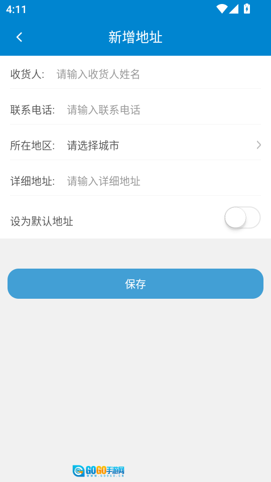 4.最后大家在“新增地址”界面,依次填写收货人姓名、联系电话、所在地区以及详细地址信息,确认无误后点击“保存”按钮,即可完成整个操作流程。