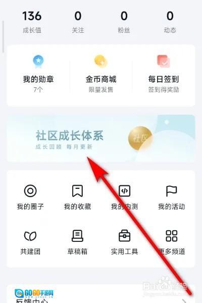 1、进入软件的个人中心页面后,找到并点击【社区成长体系】选项将其打开。