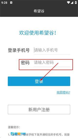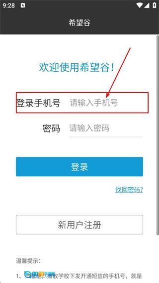 2、在希望谷的登录页面,找到登录手机号对应的输入框,在该输入框内填写手机号。