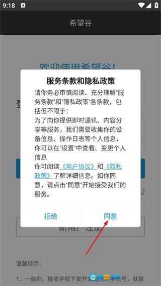 1、在服务条款与隐私政策的弹窗里,点击同意按钮,即可进入希望谷的登录页面。