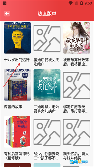 3、进入【热度版单】页面后,找到你想查看的目标书籍(例如【十八岁出门远行】),点击这本书的封面,就能进入该书籍的详情页面了。