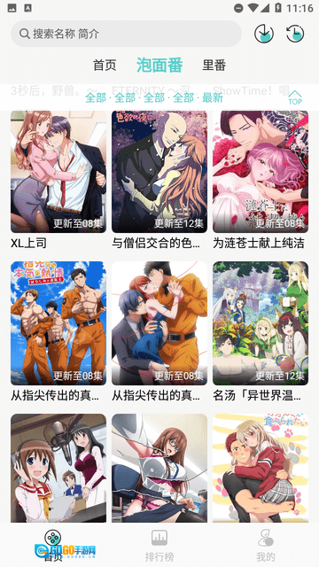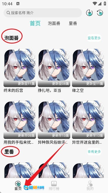 1、打开五号动漫,首页有泡面番、里番等多种番剧