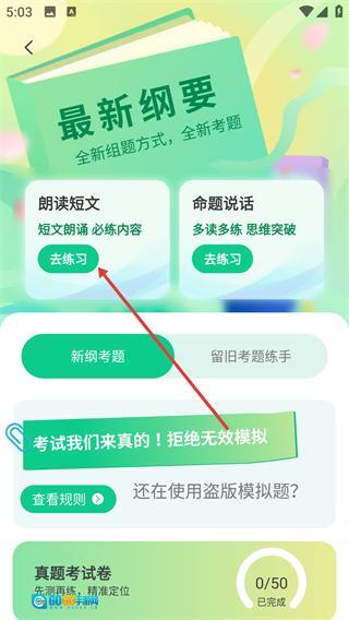 3、进入【最新纲要】页面后,点击【朗读短文】板块下的【去练习】选项,以此来训练语流音变和语调规范。