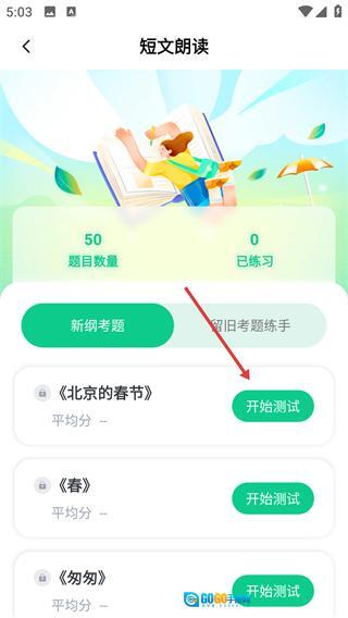 4、进入【短文朗读】页面,找到【《北京的春节》】并点击其对应的【开始测试】按钮,完成该指定篇目的练习。
