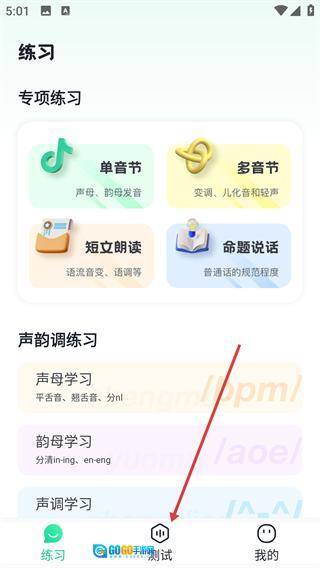 1、进入【练习】界面,选择【单音节】下的【声母、韵母发音】等专项练习,先着重巩固声韵调的基础。