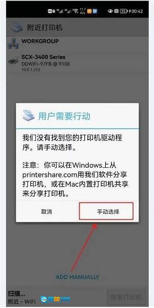 4、要是你没找到打印机驱动程序,就点击“手动选择”。