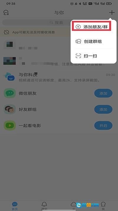2、在下拉菜单里点击“添加朋友/群”;
