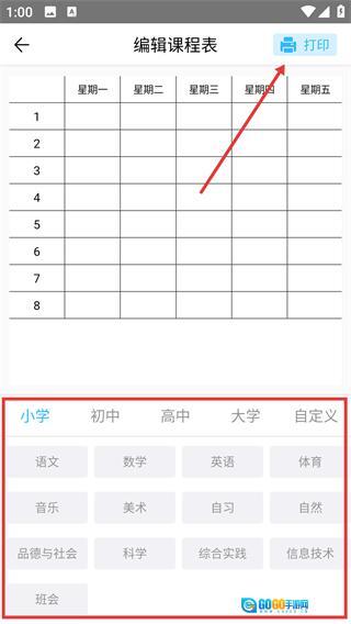 4、在生成的课程表中,可选择小学、初中等不同学段的课程进行编辑操作,编辑完成后点击【打印】按钮即可打印课程表。
