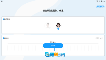 1、打开咕咚多喝水后,选择你的性别、体重。