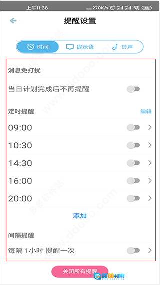 2、用户能够依据自身的需求自定义设置时间提醒,当然你也可以把所有提醒都关闭哦;