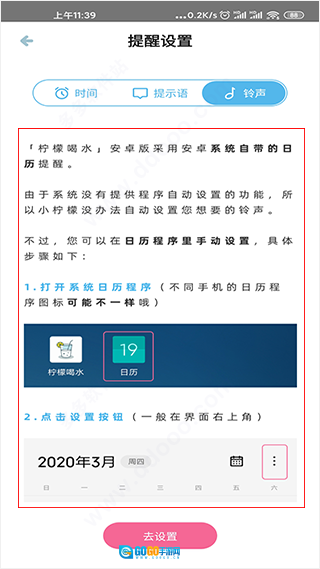 4、要是想设置铃声提醒,操作会稍显繁琐,你可以依照系统提供的图文教程,按步骤逐步完成设置。