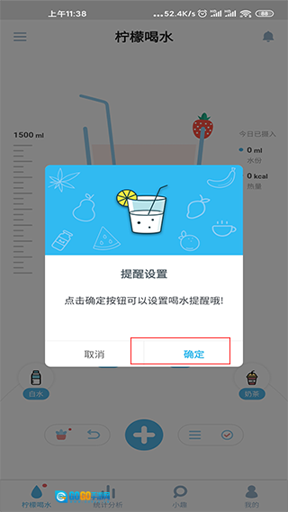 1、第一次使用这款柠檬喝水软件时,启动软件后会自动弹出“提醒设置”界面,点击“确定”按钮就能开始进行设置了;