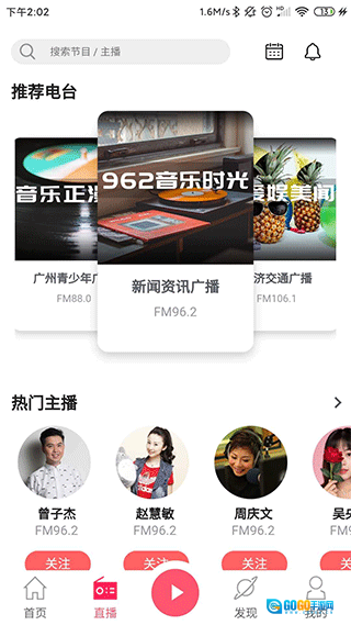 1、花城FM涵盖fm96.2新闻资讯、fm102.7汽车音乐、fm106.1交通之声以及fm88.0城市生活等频率内容。
