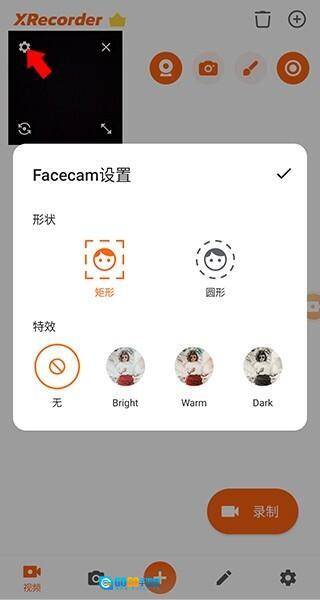 3、点击摄像头小窗后,再点击左上角的齿轮按钮,就能设置小窗的形状和滤镜;点击左下角按钮,则可切换前/后置摄像头。