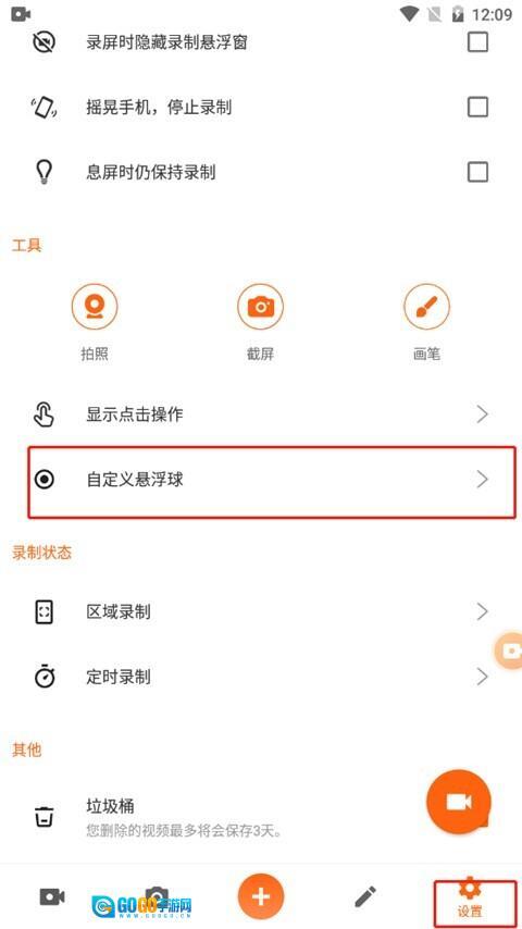 1、打开软件首页后,点击设置按钮,接着在工具选项里找到并选择自定义悬浮球;