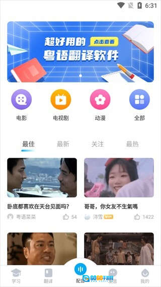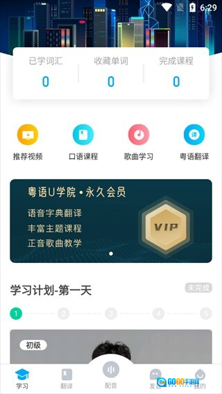 1、学习板块包含推荐视频、口语课程、歌曲学习、粤语翻译等功能。