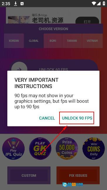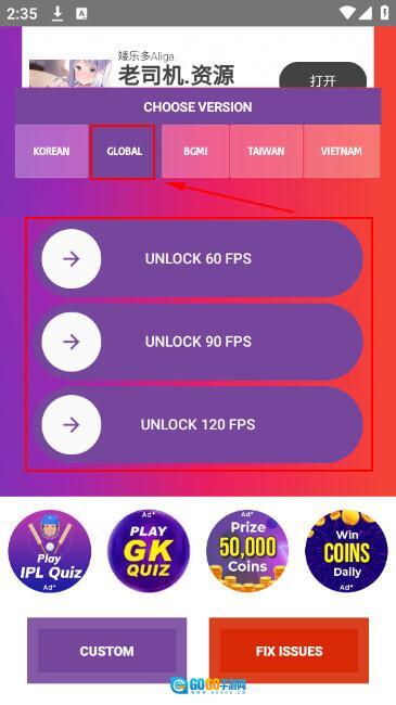2.开启90fps后,点击【GLOBAL】按钮,就能解锁60fps、90fps、120fps这几个帧率选项