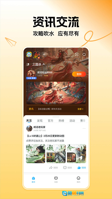 三国咸话是一款实用的游戏辅助工具平台,由杭州游卡网络技术有限公司为“三国杀”游戏量身打造。它不仅汇集了丰富的游戏攻略与资讯,还会实时推送最新的游戏动态和技巧分享,助力玩家轻松高效地提升游戏水平。此外,用户通过三国咸话能一键查询自己的游戏战绩,涵盖对局详情、胜率统计等内容,以便更深入地了解自身游戏数据,获取优质新鲜的攻略资讯,进而有效提升游戏体验。
