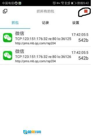 7、抓包时,你可随时点击右上角的红色方块以停止抓包操作。