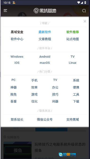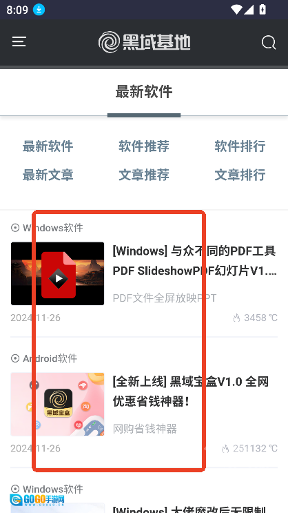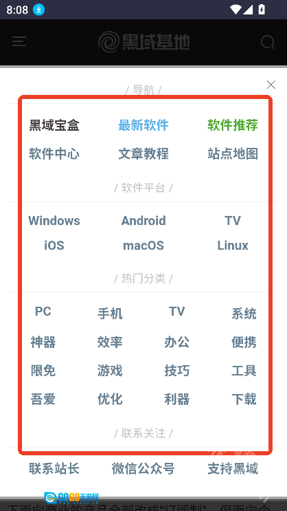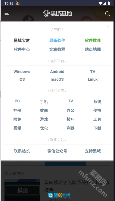 1、前往魔趣网(m.mfunz.com)下载并安装黑域基地手机版。进入应用首页后,能看到“最新软件”和“最新文章”两个板块。