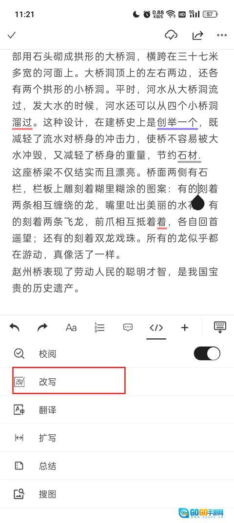 2、然后选中文章,会有格式框,点击"改写",会自动改写。