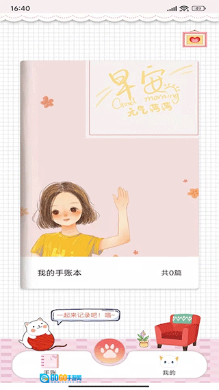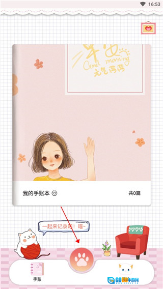 1、打开卡哇伊手账本应用,进入主界面后,点击界面中间位置的猫爪样式图案。