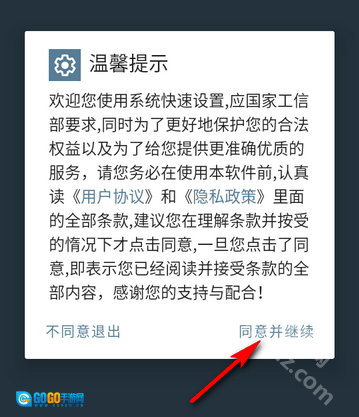 1、打开系统快速设置点击同意并继续。