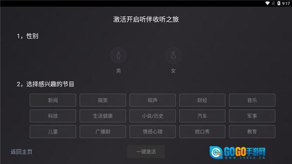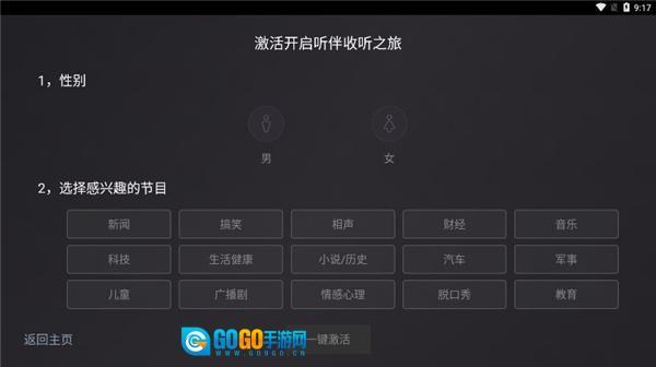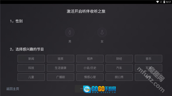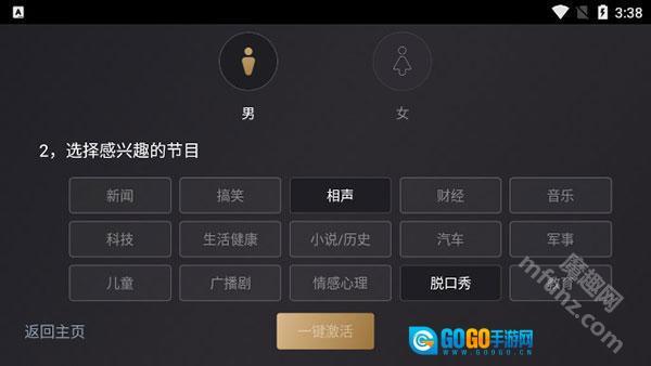 在魔趣网(m.mfunz.com)使用听伴FM车机版后,首次启动该应用时,需选择感兴趣的节目类型与性别,以此完成一键激活操作。